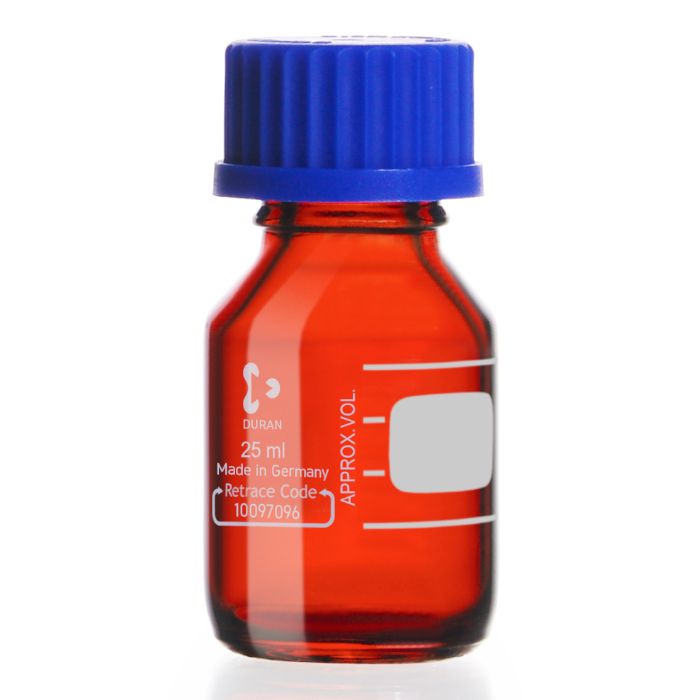 DURAN® Original GL laboratory bottles have become the gold standard of multifunctional laboratory bottles since their introduction in 1972. The bottles are moulded from high-purity, amber, USP/EP Type I DURAN® borosilicate glass 3.3, renowned for its excellent thermal performance, and high resistance to chemical attack. A combination of high-performance materials and robust ISO 4796-1 design provides a long working life. The addition of a fused, external amber layer ensures that light sensitive contents are protected from the effects of photodegradation. The protection against ultra-violet light meets international USP/EP standards and lasts the lifetime of the bottle. The amber bottles feature an easy-to-read graduated volume scale, and marking field in permanent white enamel. Permanent Retrace Code on each bottle for manufacturing lot traceability. DURAN® Original amber bottles are supplied with or without iconic blue polypropylene cap and drip-free pouring ring for use up to 140 °C. All components are fully autoclavable at 121 or 134 °C.