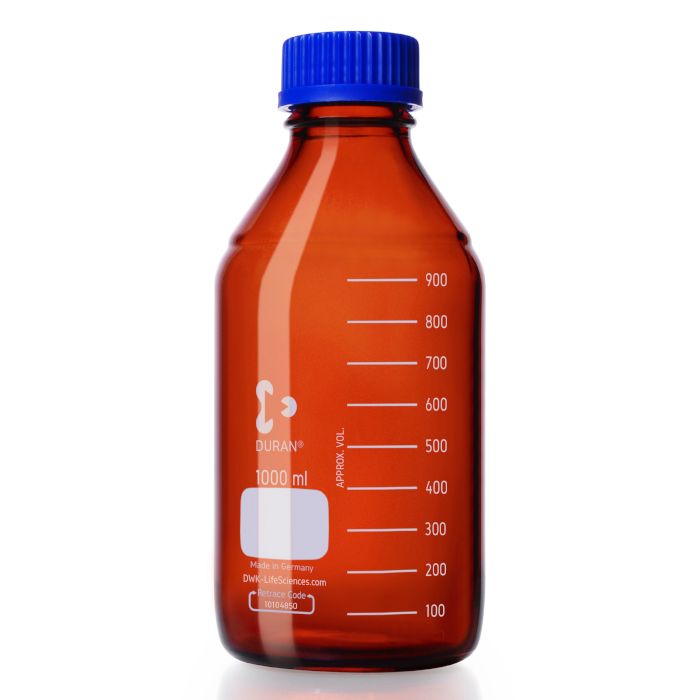 DURAN® Original GL laboratory bottles have become the gold standard of multifunctional laboratory bottles since their introduction in 1972. The bottles are moulded from high-purity, amber, USP/EP Type I DURAN® borosilicate glass 3.3, renowned for its excellent thermal performance, and high resistance to chemical attack. A combination of high-performance materials and robust ISO 4796-1 design provides a long working life. The addition of a fused, external amber layer ensures that light sensitive contents are protected from the effects of photodegradation. The protection against ultra-violet light meets international USP/EP standards and lasts the lifetime of the bottle. The amber bottles feature an easy-to-read graduated volume scale, and marking field in permanent white enamel. Permanent Retrace Code on each bottle for manufacturing lot traceability. DURAN® Original amber bottles are supplied with or without iconic blue polypropylene cap and drip-free pouring ring for use up to 140 °C. All components are fully autoclavable at 121 or 134 °C.