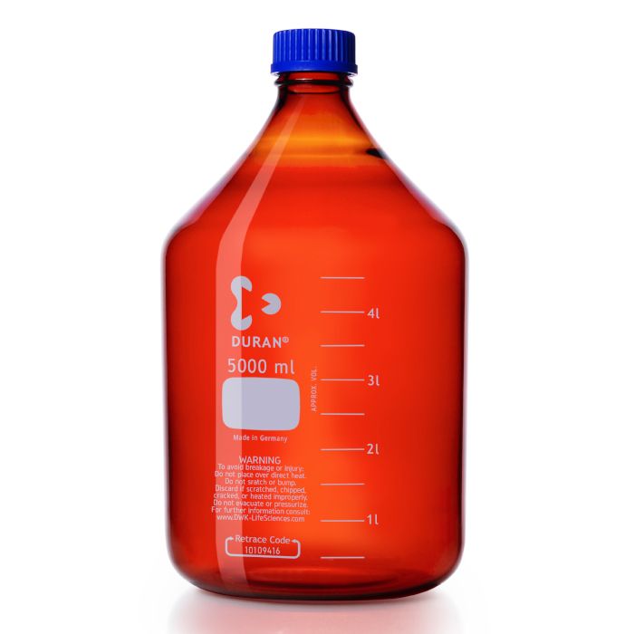 DURAN® Original GL laboratory bottles have become the gold standard of multifunctional laboratory bottles since their introduction in 1972. The bottles are moulded from high-purity, amber, USP/EP Type I DURAN® borosilicate glass 3.3, renowned for its excellent thermal performance, and high resistance to chemical attack. A combination of high-performance materials and robust ISO 4796-1 design provides a long working life. The addition of a fused, external amber layer ensures that light sensitive contents are protected from the effects of photodegradation. The protection against ultra-violet light meets international USP/EP standards and lasts the lifetime of the bottle. The amber bottles feature an easy-to-read graduated volume scale, and marking field in permanent white enamel. Permanent Retrace Code on each bottle for manufacturing lot traceability. DURAN® Original amber bottles are supplied with or without iconic blue polypropylene cap and drip-free pouring ring for use up to 140 °C. All components are fully autoclavable at 121 or 134 °C.
