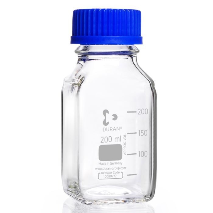 DURAN® Square laboratory bottles have a space saving shape that offers the benefit of close and efficient packing. With up to a 20 % saving of space compared to traditional round bottles. Ideal for the shipping and storage of high-demand materials. For reagent supply to instruments where bench space is at a premium. The bottles are moulded from high-purity, clear, USP/EP Type I DURAN® borosilicate glass 3.3, renowned for its excellent thermal performance, and high resistance to chemical attack. The bottles feature an easy-to-read graduated volume scale, and marking field in permanent white enamel. Permanent Retrace Code on each bottle for manufacturing lot traceability. DURAN® square bottles are supplied complete with iconic blue polypropylene cap and drip-free pouring ring for use up to 140 °C. All components are fully autoclavable at 121 or 134 °C.