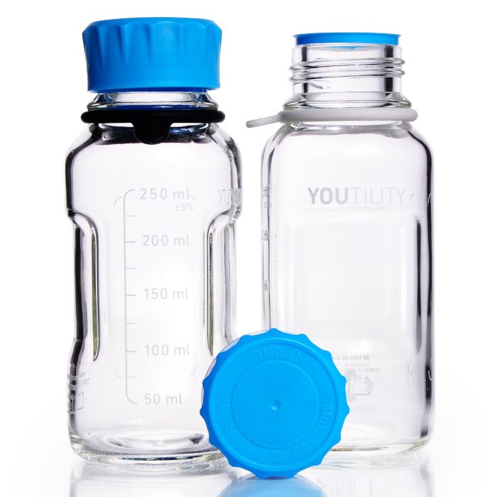 International award winning design. The specially shaped recessed grips on both sides of the bottle ensure easy and safe handling. The slim shape of the YOUTILITY® bottle saves space when used in autoclaves and laboratory refrigerators. The bottles can also be stored horizontally on their side. A specially marked area fits perfectly with the self-adhesive DURAN® YOUTILITY® labels. The bottles are available in sizes 125, 250, 500 and 1000mL. They are made from the tried and tested DURAN® borosilicate glass 3.3, a neutral glass that corresponds to glass Type 1 according to the European Pharmacopoeia. DURAN® glass offers very high chemical resistance and high temperature resistance.