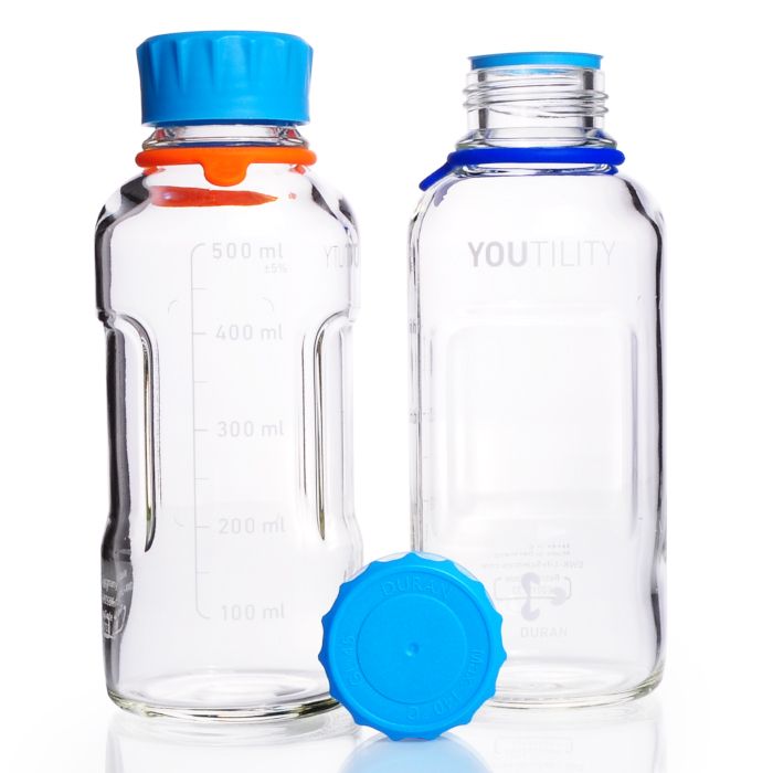 International award winning design. The specially shaped recessed grips on both sides of the bottle ensure easy and safe handling. The slim shape of the YOUTILITY® bottle saves space when used in autoclaves and laboratory refrigerators. The bottles can also be stored horizontally on their side. A specially marked area fits perfectly with the self-adhesive DURAN® YOUTILITY® labels. The bottles are available in sizes 125, 250, 500 and 1000mL. They are made from the tried and tested DURAN® borosilicate glass 3.3, a neutral glass that corresponds to glass Type 1 according to the European Pharmacopoeia. DURAN® glass offers very high chemical resistance and high temperature resistance.