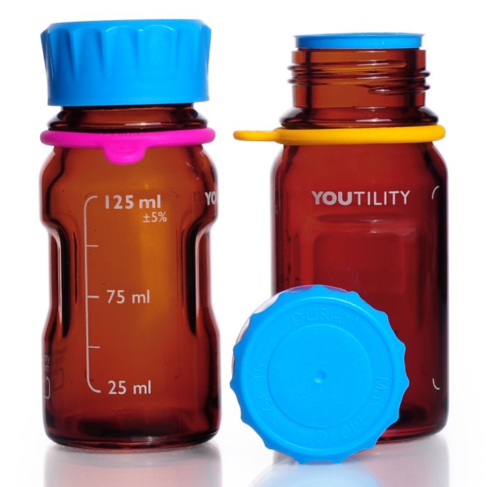 International award winning design. The specially shaped gripping zones on both sides of the bottle permit easier and safer handling. The slimmer YOUTILITY bottle shape allows a more optimal use of limited space in autoclaves and laboratory refrigerators. The bottles can be conveniently stacked horizontally on their sides. A pre-defined labelling area is compatible with the dedicated self-adhesive YOUTILITY bottle labels. Sequentially sized bottles 125, 250, 500 and 1000mL. The glass bottles are moulded from the tried and tested DURAN® borosilicate 3.3, a pharmacopoeial Type 1 neutral glass. DURAN® glass offers a very good chemical resistance and high temperature resistance. As an alternative to clear DURAN® glass, the amber coloured glass offers protection against ultraviolet light for light sensitive material, and fully meets the requirements of the USP and Eur. Ph. 3.2.1. The amber colour is permanently fired into the exterior glass surface. The treatment does not affect the properties of the inner surface of the bottle. The amber bottles can be used for the storage or transport of chemicals sensitive to light.
