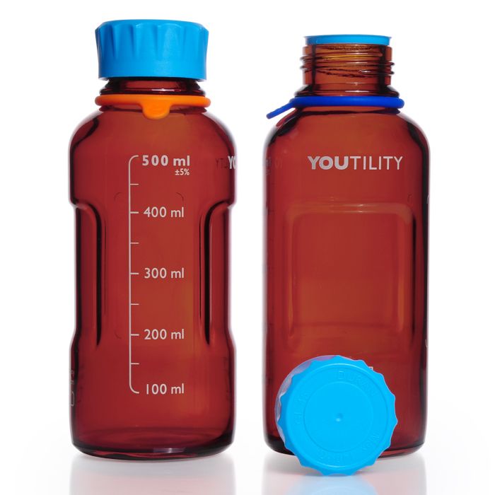 International award winning design. The specially shaped gripping zones on both sides of the bottle permit easier and safer handling. The slimmer YOUTILITY bottle shape allows a more optimal use of limited space in autoclaves and laboratory refrigerators. The bottles can be conveniently stacked horizontally on their sides. A pre-defined labelling area is compatible with the dedicated self-adhesive YOUTILITY bottle labels. Sequentially sized bottles 125, 250, 500 and 1000mL. The glass bottles are moulded from the tried and tested DURAN® borosilicate 3.3, a pharmacopoeial Type 1 neutral glass. DURAN® glass offers a very good chemical resistance and high temperature resistance. As an alternative to clear DURAN® glass, the amber coloured glass offers protection against ultraviolet light for light sensitive material, and fully meets the requirements of the USP and Eur. Ph. 3.2.1. The amber colour is permanently fired into the exterior glass surface. The treatment does not affect the properties of the inner surface of the bottle. The amber bottles can be used for the storage or transport of chemicals sensitive to light.