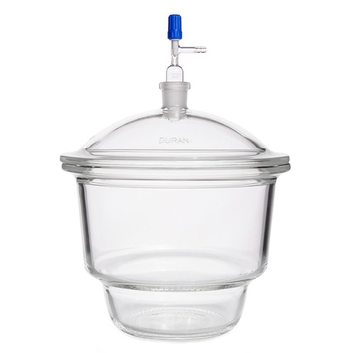 The DURANĀ® desiccator is a vacuum-suitable laboratory vessel with a ground lid, which is used for storing moisture-sensitive substances and for drying moist products. Separated by a sieve plate (made of metal or porcelain), a drying agent is introduced into the lower part of the desiccator base, which binds the moisture of the substance to be dried, placed on the sieve plate. To accelerate the drying process, a vacuum can be connected if necessary, as the liquid evaporates faster due to a lower pressure in the desiccator. The vacuum is applied via a shut-off valve connection. To facilitate loosening of the lid, the surface grinding of the desiccator must be well greased, since after evacuation the lid is pressed onto the lower part. All DURANĀ® desiccators are vacuum-resistant, i.e. they can be used up to the technically maximum possible vacuum.
