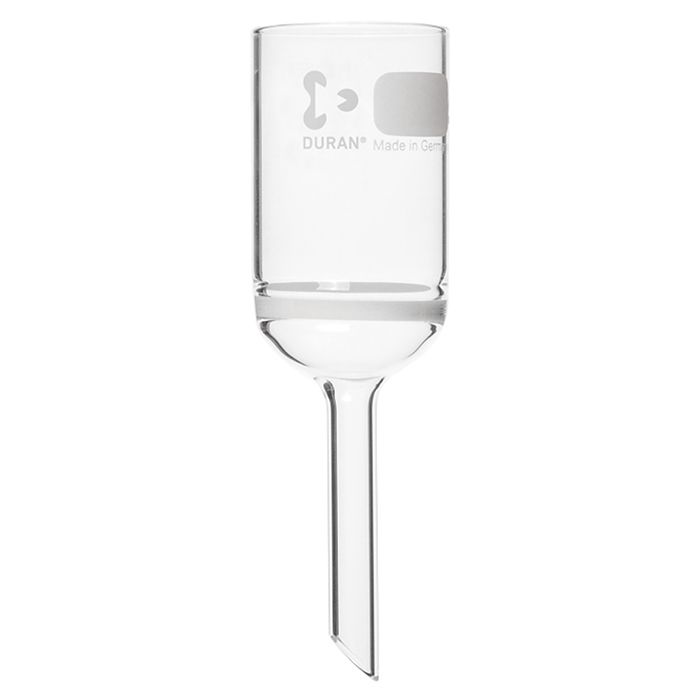 One of the most important separation methods in the laboratory environment is filtration, which is used to separate or clean different media. For this working method, filters are required which are selected according to the application with regard to size and porosity. Büchner funnels are cylindrical with an integral sintered disc. Without additional filter paper, only coarse filtration is possible. Büchner funnels can also be used in vacuum filtration. The applied vacuum accelerates the filtration.