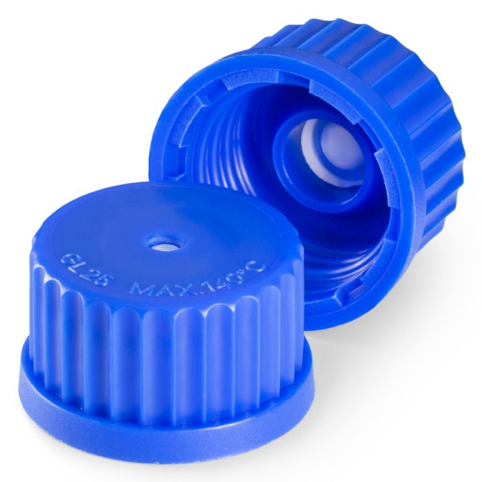 DURANĀ® membrane venting screw caps can be used for safer autoclaving of media, or in cell incubator culture requiring high rates of gas exchange. The screw cap can be tightly closed as the membrane permits an automatic sterile gas exchange, allowing safe pressure equalisation during the autoclave cycle, and at the same time ensuring the sterility of the bottle contents. Large exposed sterile-filter surface area allows efficient gas exchange rates for cell culture applications in bottles and shaker flasks. DURANĀ® Original GL Screw Capped Laboratory bottles are ideal containers for sterilising and storing sterile media or buffer solutions. However, it is strongly recommended that during the autoclaving cycle the caps are only loosely tightened. Heating times are reduced if the steam is easily able to penetrate the contents of the bottle. Loose caps also reduce the risk of failure due to pressure build up inside the bottle, which can reach 400 kPa (absolute). In addition, tightening the screw caps immediately after autoclaving, will result in a vacuum caused by the cooling of the steam. This can lead to bottle failure, and is an especially important consideration for larger bottles. To overcome these limitations, the sterile venting membrane screw caps were developed. Membrane caps with hydrophobic PTFE membranes, facilitate optimal gas exchange by allowing gases like oxygen and carbon dioxide to pass through while preventing microbial contamination.