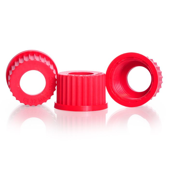 Open topped cap with central aperture suitable for use with bromobutyll stoppers, silicone piercing septa or glassware connections. Glass reinforced red PBT offers high temperature (180c) and chemical resistance.