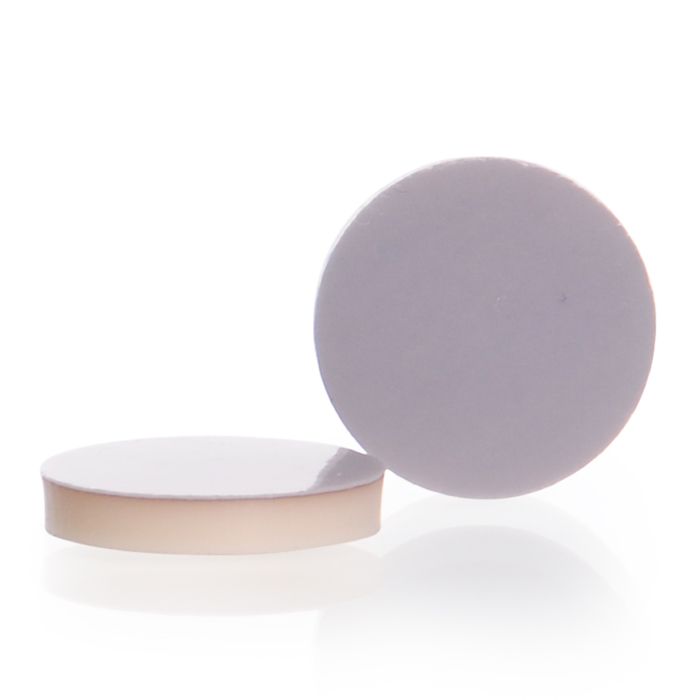 Replacement cap liners suitable for PBT screw caps and tamper-evident screw caps. Heat resistance to 130 °C (steam) and 200 °C (dry heat). Excellent chemical resistance due to PTFE coating. Silicon is peroxide catalysed.