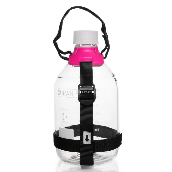 The Bottle Carrying System range fits standard laboratory bottles that have a GL 45 neck finish, and are available for four bottle sizes: 2, 5, 10 or 20 litres. The carriers are ergonomically designed and offer health and safety benefits to the user. They allow the easy and safe transport of bottles around the laboratory or production facility. All materials are fully autoclavable. The carrier for the 10L bottle has a pair of carrying handles for lifting by two people. The collar that fits to the neck of the bottle is only removable by cutting, so the attachment is 100 % secure in use.