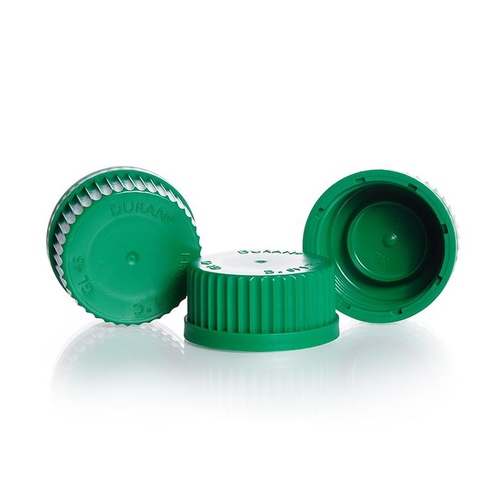 The classic laboratory bottle GL threaded screw cap features the tried and tested cap plug sealing system ensuring a liquid tight seal. Available in four colours; blue, green, yellow and grey with matching pouring rings. Distinguishing media types is simplified and interchanging of screw caps and the risk of cross contamination is greatly reduced.