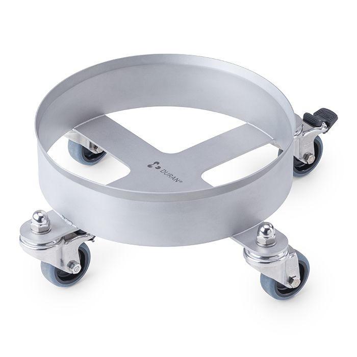 Ideal for users who have to handle large glass GL 45 laboratory bottles. The system was developed to help users safely handle the larger laboratory bottles, which can be heavy and difficult to move when filled with liquid. The DURANĀ® GL 45 Bottle Carrying System is built around a specially designed GL 45 bottle collar that securely engages around the bottleneck. Anti-slip, high-strength polypropylene strapping holds the bottle body securely in place. One of the risks during transportation is accidental impact, and for this reason, a shock absorbing silicone rubber component protects the base of the bottle. All of the system components can be autoclaved, and cleaned while attached to the DURANĀ® bottles. The product range consists of four, dedicated manual carriers for the 2, 5, 10 or 20 litre GL 45 glass lab bottles with optional metal dollies. The exact configuration offered depends on the bottle size: The 5-litre and 10-litre carrying system has a side handle that allows the contents to be safely poured in a controlled way. The 10 and 20 litre bottle carriers, feature two ergonomically shaped carrying handles to allow two-person lifting.
