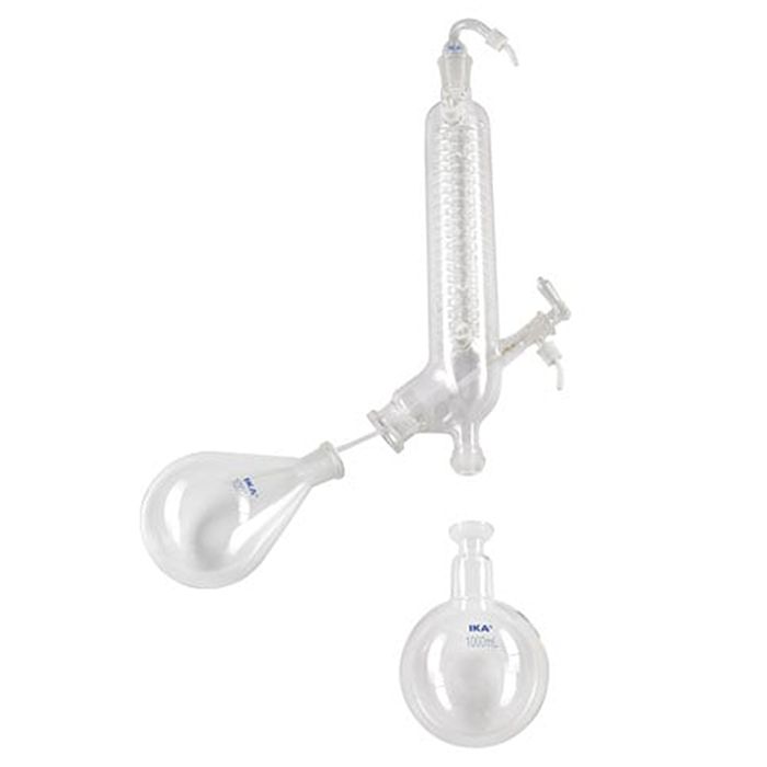 Vertical condenser for all standard distillations, compact. The solvent to be distilled can be continuously fed in through the PTFE inlet tube. A 1000 ml evaporator and 1000 ml receiving flask are included. Condenser and receiving flask coated for shatter protection.