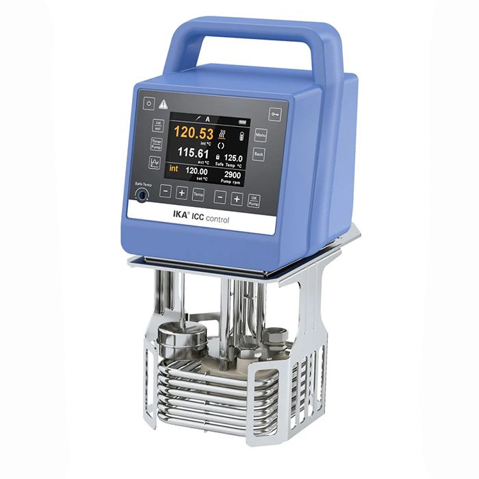 Compact immersion circulator ICC control for tempering of liquids up to 150 °C. Suitable to use in open or covered bath vessels.The integrated pressure/ suction pump allow ICC control to be used for internal and external applications. Just connect the optional pump set. ICC control also has an optional cooling coil that allows to work close to ambient temperatures. The program function can save and run up to 10 individual procedures with 10 steps.The ICC control circulator is first in its class with an integrated carrying handle that allows for comfortable transport and safe storage thanks to its clever stand.The large, colour TFT screen offers intuitive controls of all process parameters.