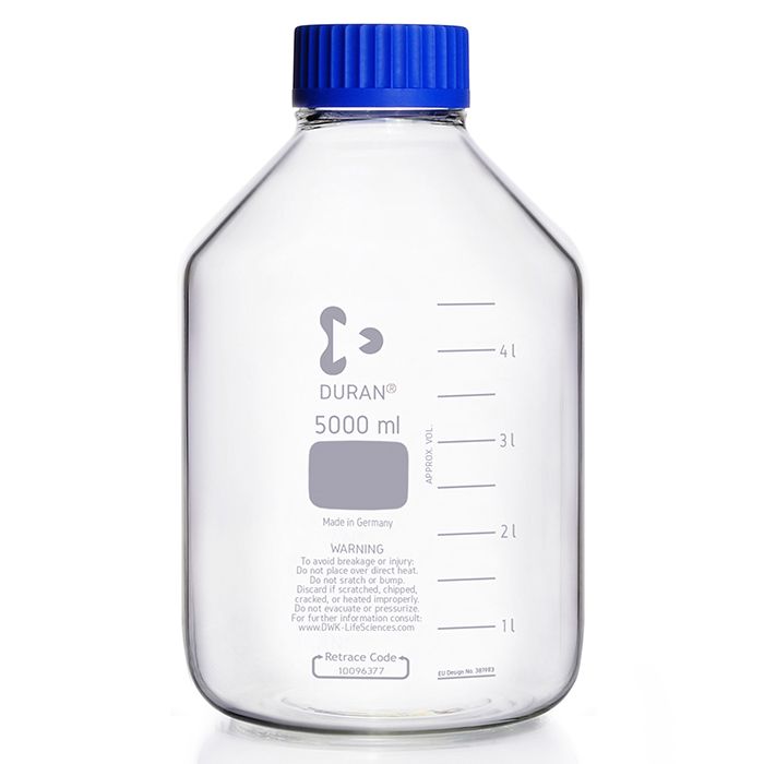 DURAN® wide mouth GLS 80® laboratory bottles are moulded from high-purity, clear, USP/EP Type I borosilicate glass 3.3, renowned for its excellent thermal performance, and high resistance to chemical attack. A combination of high-performance materials and robust ISO 4796-1 design provides a long working life. The bottles feature an easy-to-read graduated volume scale, and marking field in permanent white enamel. Permanent Retrace Code on each bottle for manufacturing lot traceability. DURAN® wide mouth GLS 80® are supplied complete with blue polypropylene cap and drip-free pouring ring for use up to 140 °C. All components are fully autoclavable at 121 or 134 °C.