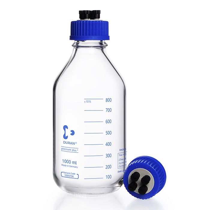 - Complete system comprising: Duran pressure plus+ laboratory bottle with 4-port GL45 screw cap, four screw connections (black, M8 thread), 12 x silicone seals (4 x 1.6mm, 4 x 3.2mm, 4 x blanks)