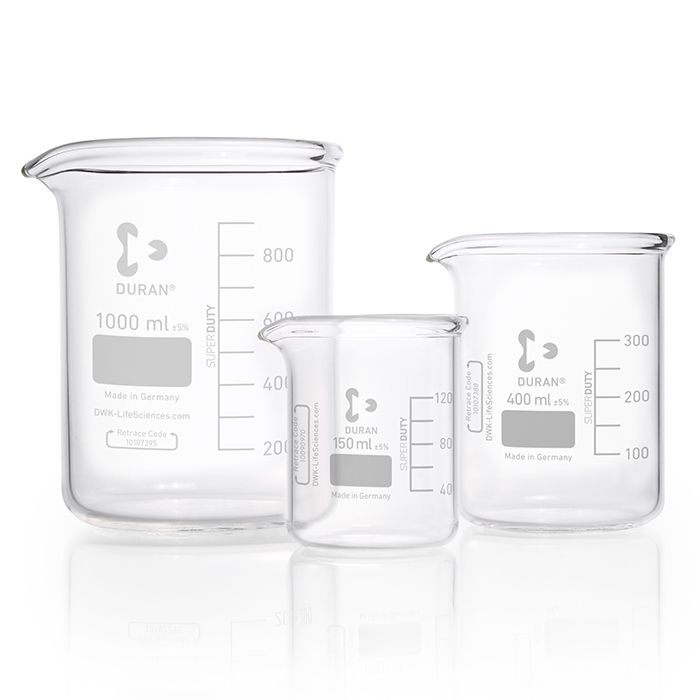 Beakers are cylindrical vessels with a straight side wall. Thanks to this shape, beakers are universally usable laboratory vessels and usually serve as collective vessels and for preparing, mixing and heating solutions. Easy filling is possible via the large vessel opening.