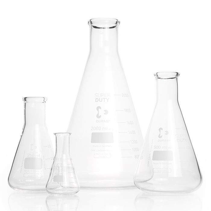 Thanks to their exceptional properties, such as excellent chemical resistance, nearly inert behaviour and high usage temperature, the original DURAN® Erlenmeyer flasks are ideal for use in laboratories. Moreover, the uniform wall thickness, minimal thermal expansion and the resultant high thermal shock resistance are outstanding characteristics. Therefore, DURAN® Erlenmeyer flasks are particularly suited to use with very high temperatures and fast temperature changes.