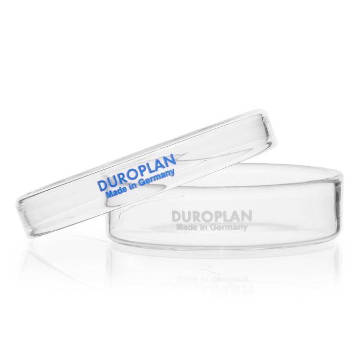 Cultivation of microorganisms can take place on a gel-like nutrient medium, which is placed in a flat, round, transparent dish with lid (the so-called Petri dish). Due to the solid gel, mixing of the microorganisms is prevented and larger cell culture accumulations (colonies) can grow. DURANĀ® Petri dishes are manufactured from borosilicate glass 3.3 using a special manufacturing process. They allow an even distribution of the culture medium and guarantee a distortion-free view. The lids of the DURANĀ® Petri dishes rest directly on the lower part and thus prevent turbulence of the protruding air space. This is well suited for reactions with long incubation times, at high temperatures or with sensitive culture media.