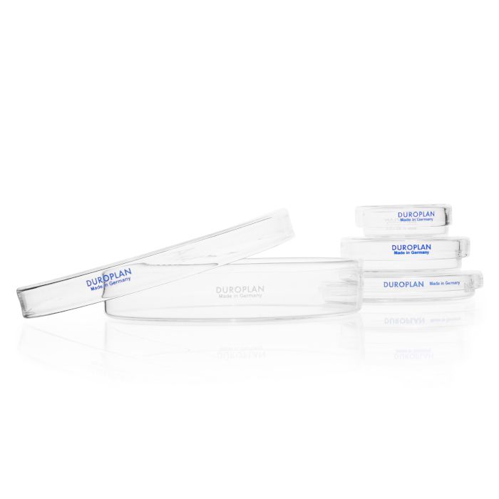 Cultivation of microorganisms can take place on a gel-like nutrient medium, which is placed in a flat, round, transparent dish with lid (the so-called Petri dish). Due to the solid gel, mixing of the microorganisms is prevented and larger cell culture accumulations (colonies) can grow. DURANĀ® Petri dishes are manufactured from borosilicate glass 3.3 using a special manufacturing process. They allow an even distribution of the culture medium and guarantee a distortion-free view. The lids of the DURANĀ® Petri dishes rest directly on the lower part and thus prevent turbulence of the protruding air space. This is well suited for reactions with long incubation times, at high temperatures or with sensitive culture media.